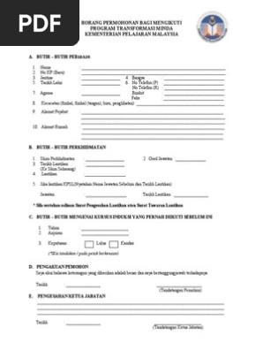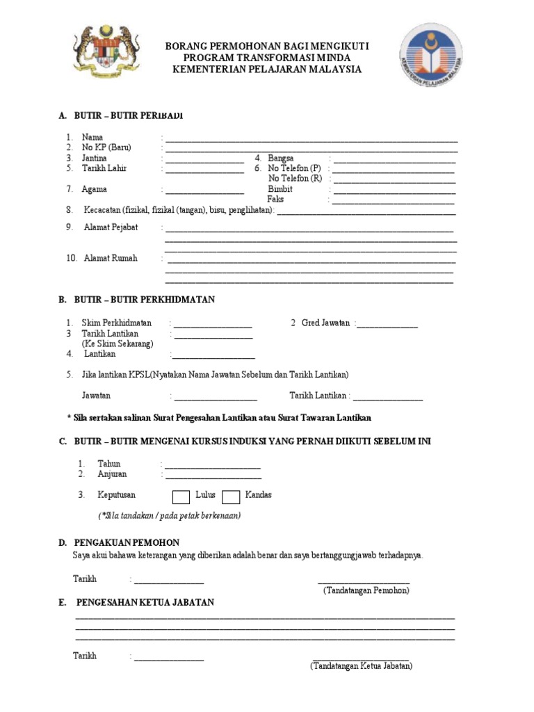 Senarai Semak Perakuan Urusan Pengesahan Dalam Perkhidmatan Lampiran C Muat Turun. Borang permohonan program transformasi minda kementerian pendidikan malaysia. Borang Tuntutan Skim Takaful Pelajar Sekolah Malaysia pdf 579 MB 3798 muat turun Popular.